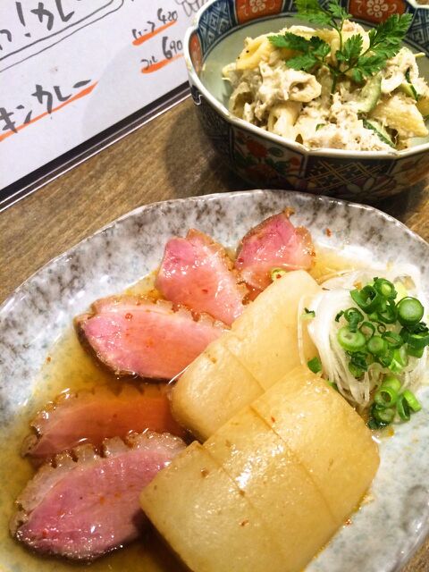 写真の料理は 『大根と合鴨の炊き合わせ』 と『自家製ツナのマカロニサラダ』 でございますっ!