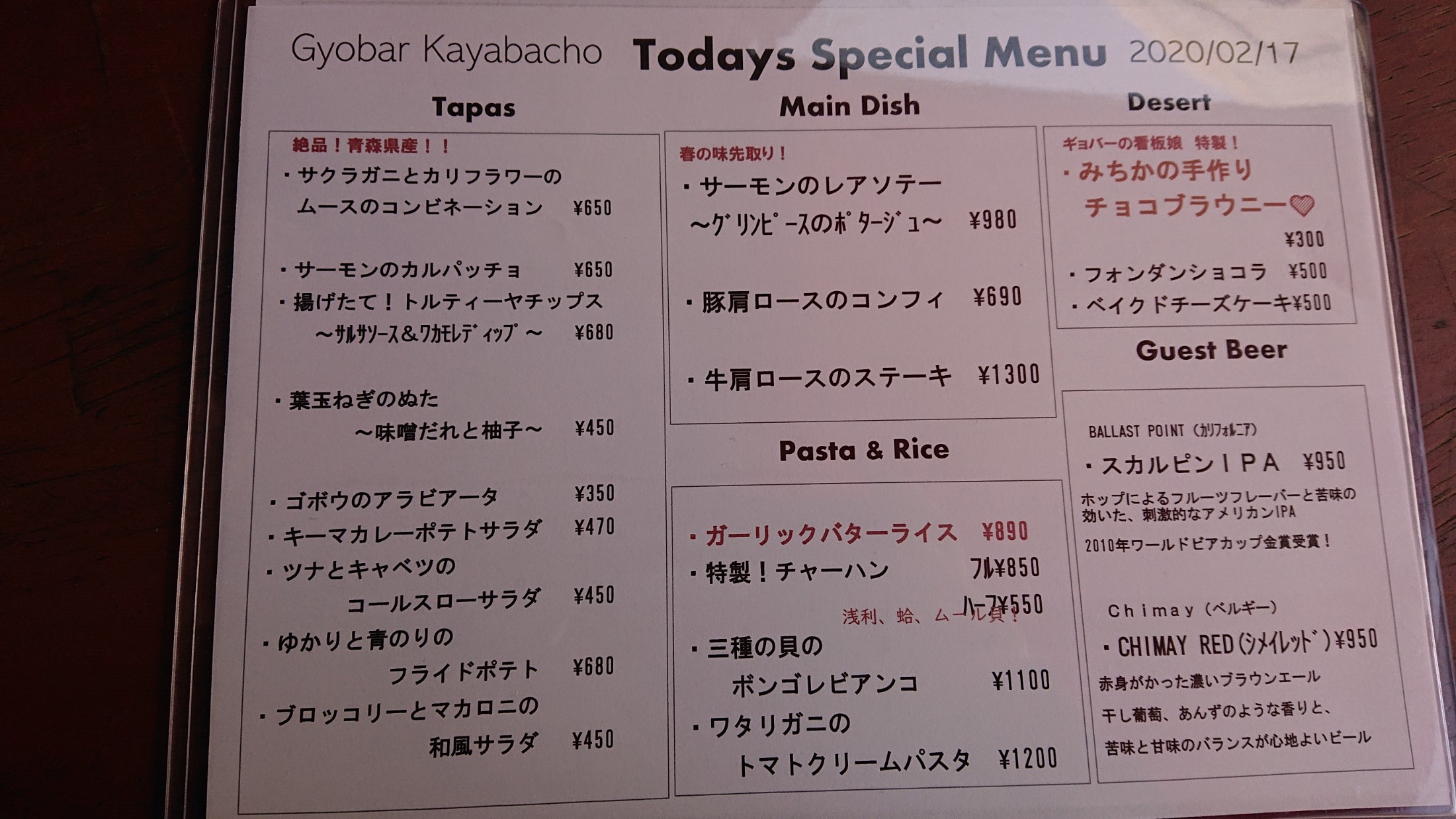 本日のオススメは ★サクラガニとカリフラワーのムースの コンビネーション こちら!絶品です!!白ワインにぴったりの一品♪ ★キーマカレーポテトサラダ ★サーモンのレアソテー ~グリンピースのポタージュ~ ★豚肩ロースのコンフィ ★ワタリガニのトマトクリームパスタ ★みちかの手作りブラウニー などなど!!