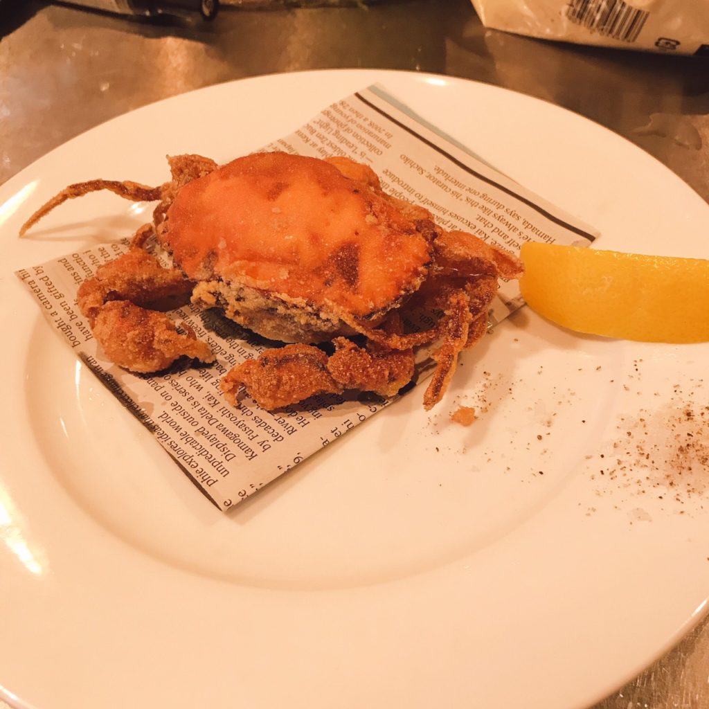 脱皮したてのカニちゃんをパスタなどを作るときに使用するセモリナ粉で上げてます♪サクサクのジューシーに仕上がってますよぉ♪